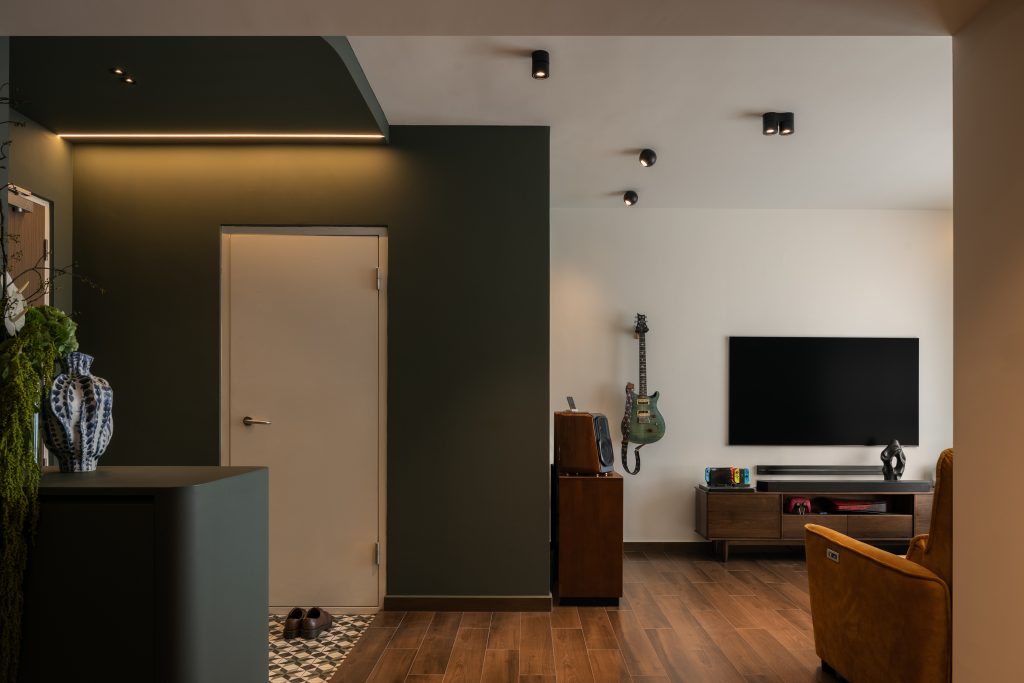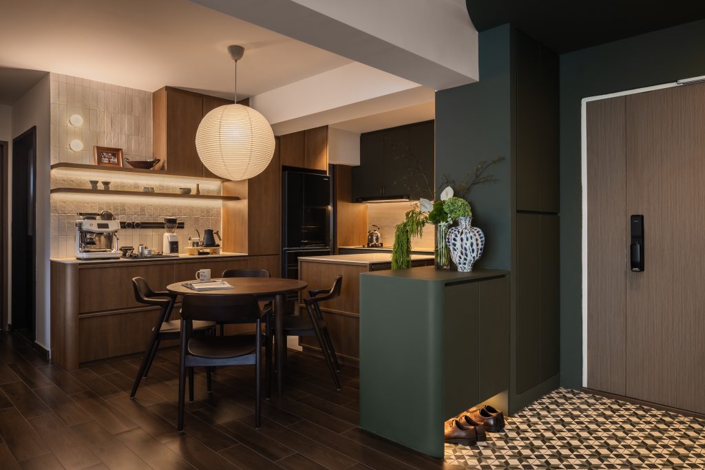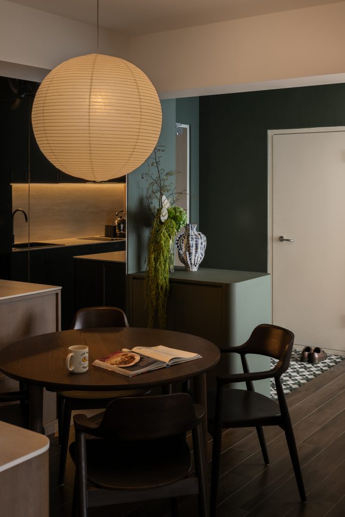 In this four-room home, mid-century aesthetics guide the design, weaving comfort with sophistication. Deep green tones pair with warm wood, while a walnut dining table anchors the space in quiet elegance. Mirrors introduce depth and a sense of breath to the interior.
