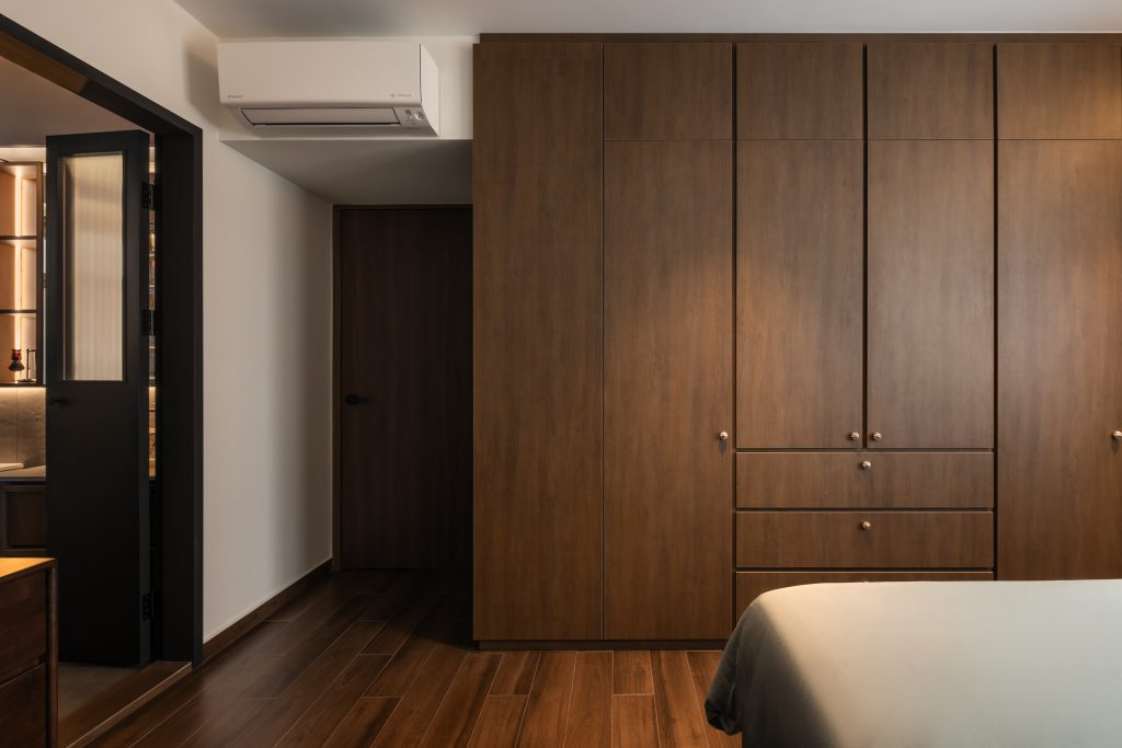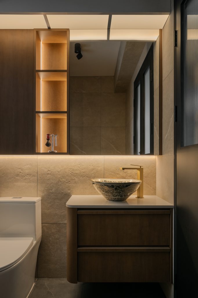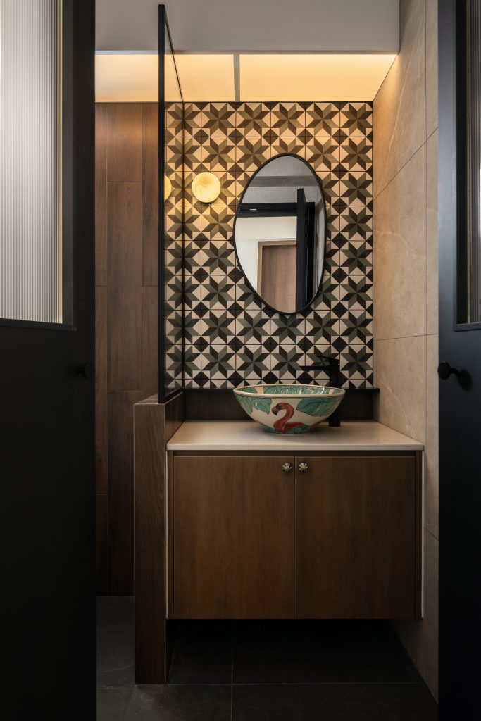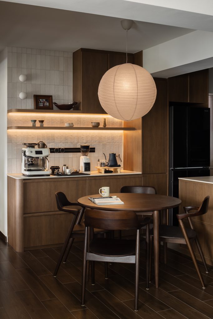 The dialogue between materials and lighting brings a layered atmosphere: the warmth of wood, the coolness of metal, and the dance of light and shadow together sketch a home that is both lived-in and poetic.