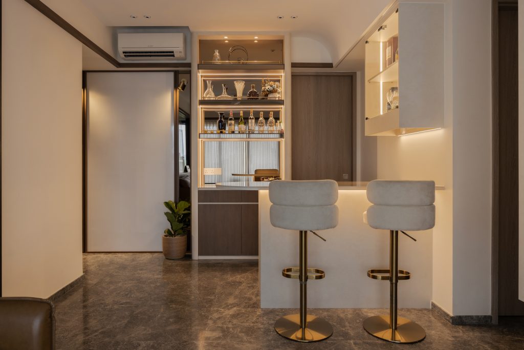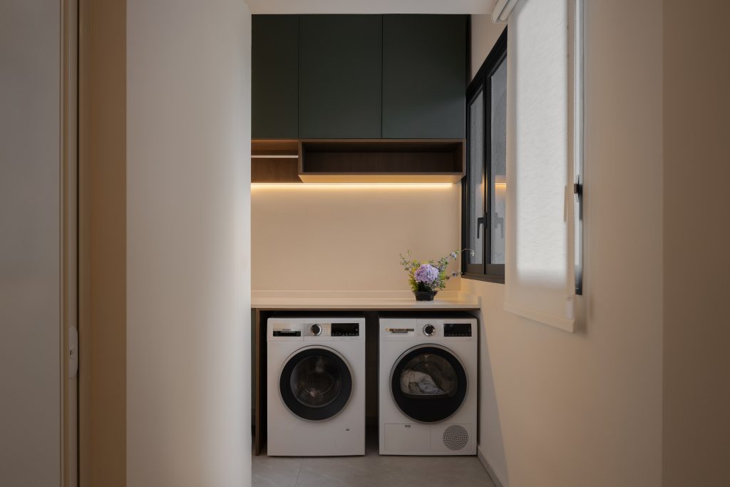 At the entrance, we added a shoe cabinet, and beside it, we installed a whiteboard laminate panel to encourage interaction between the homeowners and their children. Due to the flooring color, we chose dark wood tones to complement the overall design. Additional storage spaces were also incorporated throughout the home to make organizing more convenient for the homeowners.