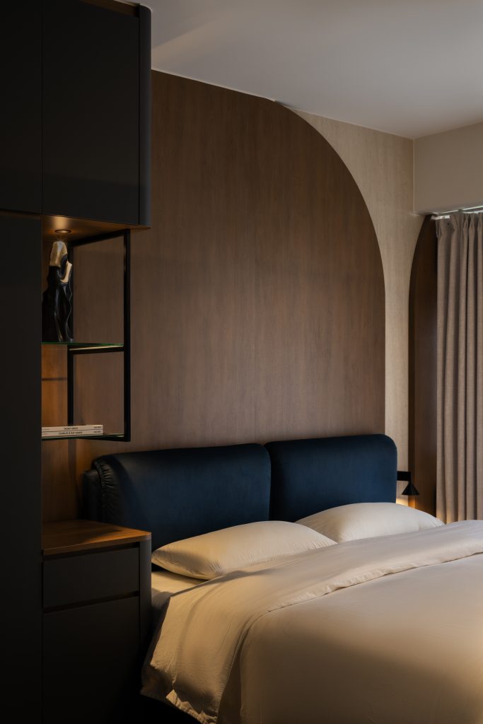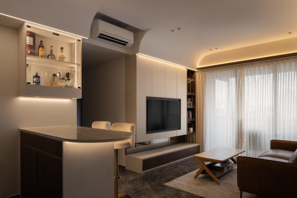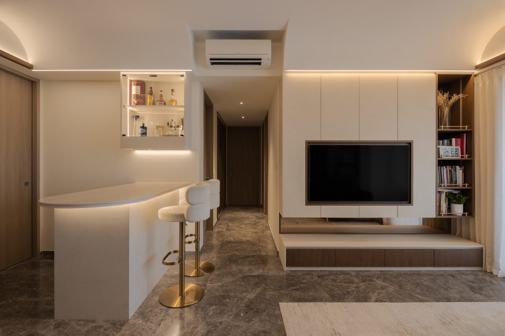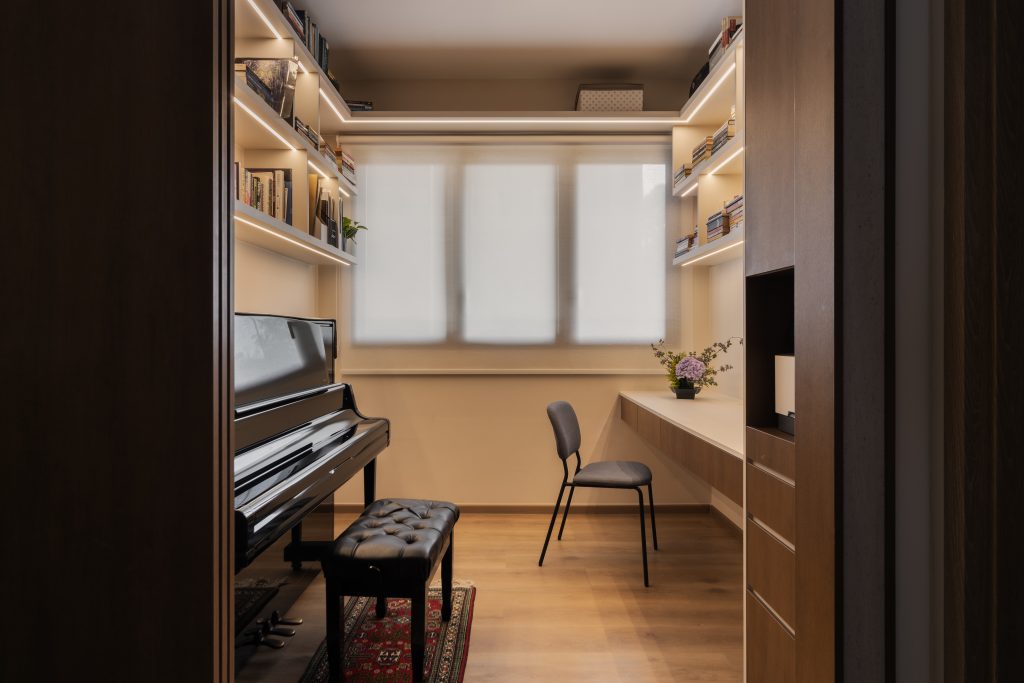 The main design concept of the space is based on modern and contemporary styles. Since the homeowners have a large collection of books, we designed multiple open shelves to store them. They were not concerned about dust, so I used open shelving to make the space feel less constrained and to reduce reflections caused by glass doors.