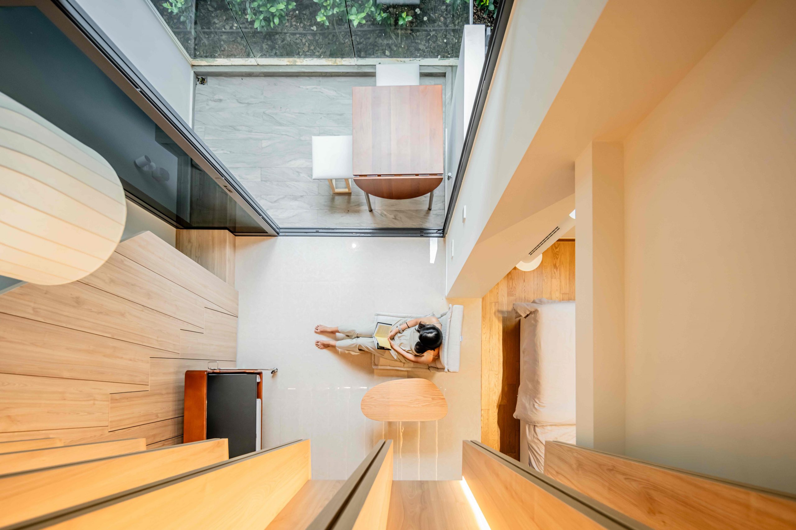 This detachment from the shared wall with the neighbouring house allows the lining of the skylight above the lofty living and dining rooms on the first storey to animate the spaces with the diurnal passing of the sun, subtly telling time.