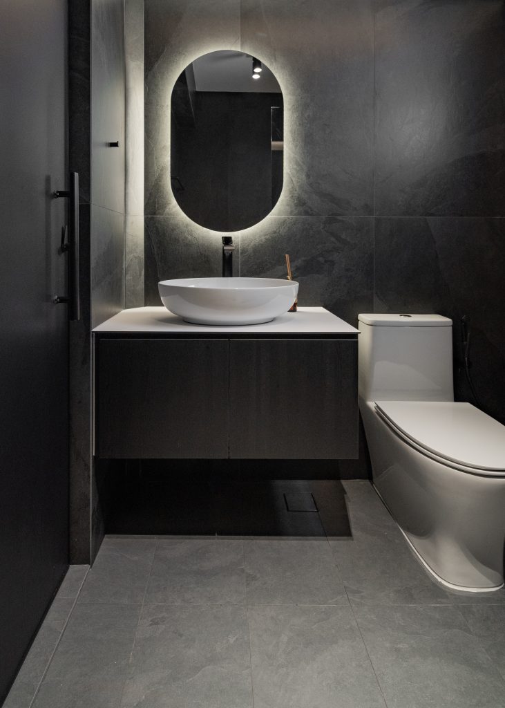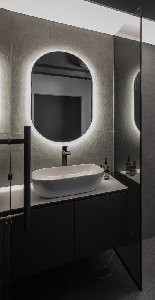 Playing with stark contrasts with white walls / ceilings and dark carpentry / flooring, the aim of the homeowners was for us to design their 5-room flat such that we balance the space planning and aesthetics, with sufficient storage and display areas to cater to their hobbies. One of the main wants was to create a display area for their Bearbrick collection, as well as a nook for their watch collection near the window, as those watches were solar powered. We also designed a walk-in-wardrobe with a concealed door in the master bedroom so that the different schedules of the couple wouldn’t affect each other.