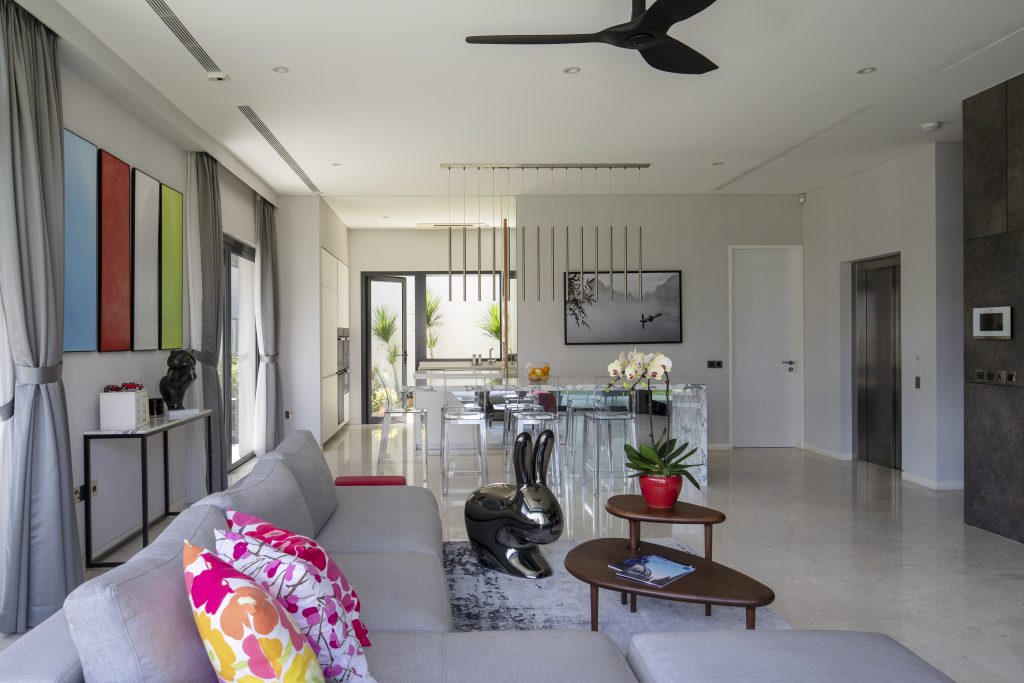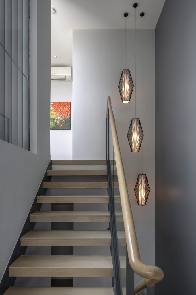 For this returning couple, both high-flying professionals relocating back to Singapore, the brief was simple: a contemporary, timeless home with a hotel-like feel. Taking cues from the house’s façade, I wrapped the entire interior in fabric wallpaper to evoke a soft, luxurious atmosphere. The couple entertains family often, so I relocated the dining area to the basement which is a bold move that suited the structure, as guests enter from that level. A square dining table I previously designed for them was brought into the new space for continuity. The wife enjoys cooking, so a marble and mirror-clad island was created as the heart of the home where is serves as a place for conversations, gatherings, and everyday moments. Clean, simple detailing runs throughout, while feature lighting at varied heights celebrates the home’s generous ceiling height. With shared trust and understanding, this project flowed seamlessly as a sophisticated, personal home tailored exactly to their lifestyle.