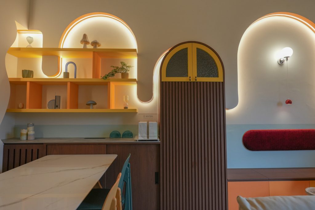 This office design embodies a Playful Modern Eclectic style, where creativity meets function in a space full of bold character and expressive detail. A rich mix of textures—such as velvet drapes, fluted wood, concrete, and terrazzo—adds depth and tactility, while arched motifs and curved shelving soften the architecture with a whimsical charm. The palette blends deep jewel tones with warm pastels, balancing professionalism with artistic flair. Custom carpentry, layered lighting, and thoughtful zoning create a space that is both practical and visually engaging—ideal for a creative studio or branding-focused workspace that values individuality, inspiration, and innovation.